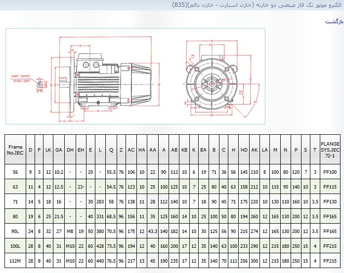 مشخصات ابعادی الکتروموتور تک فاز صنعتی دو خازنه موتوژن