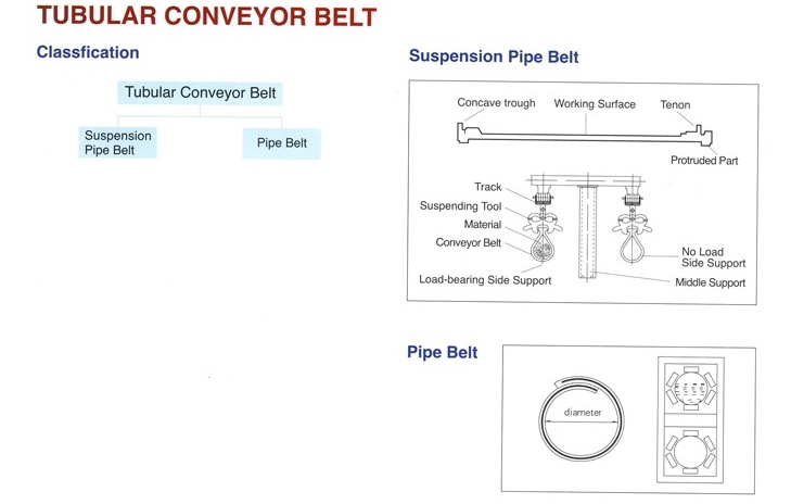 این نوار نقاله های لوله ای در انواع مختلف : مقاوم در برابر فرسایش ، مقاوم در برابردما ، مقاوم در برابر سرما ، مقاوم در برابر مواد شیمیایی ، ضد جرقه و ضد الکتریسیته ساکن و ... قابل تولید می باشند.