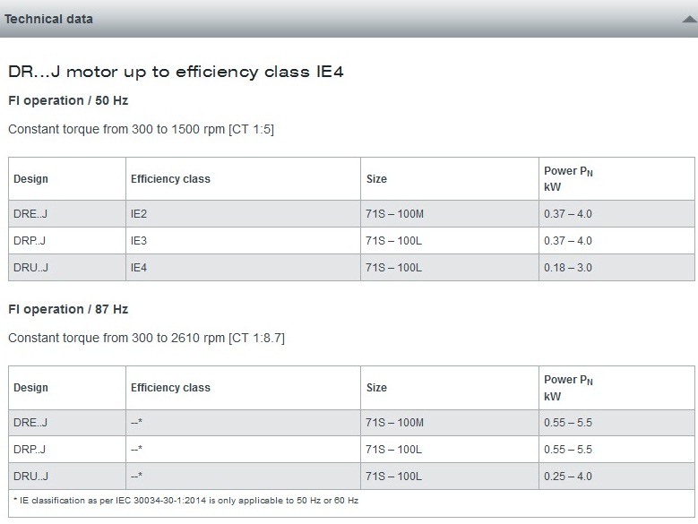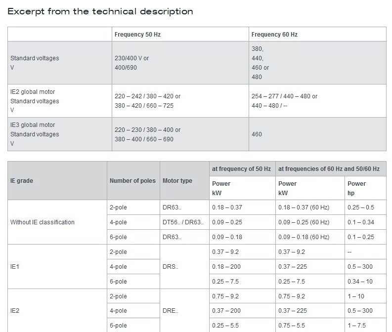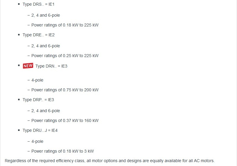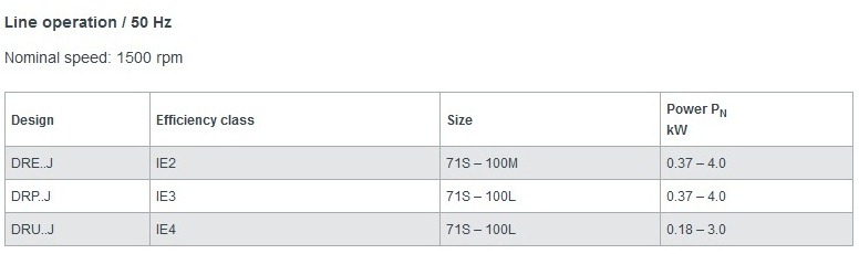 انتخاب الکتروموتور (با مصرف انرژی بهینه) مناسب برای کاربرد موردنظر خریداران در شرکت SEW بسیار ساده است.الکتروموتورهای سری DR طراحی بسیار مناسبی (در رنج خودشان) برای کاربردهای عمومی در کلاس های بازدهی IE1 تا IE4 هستند : DRS برای IE1 ، DRE برای IE2 ، DRN & DRP برای IE3 ، DRU برای IE4 .